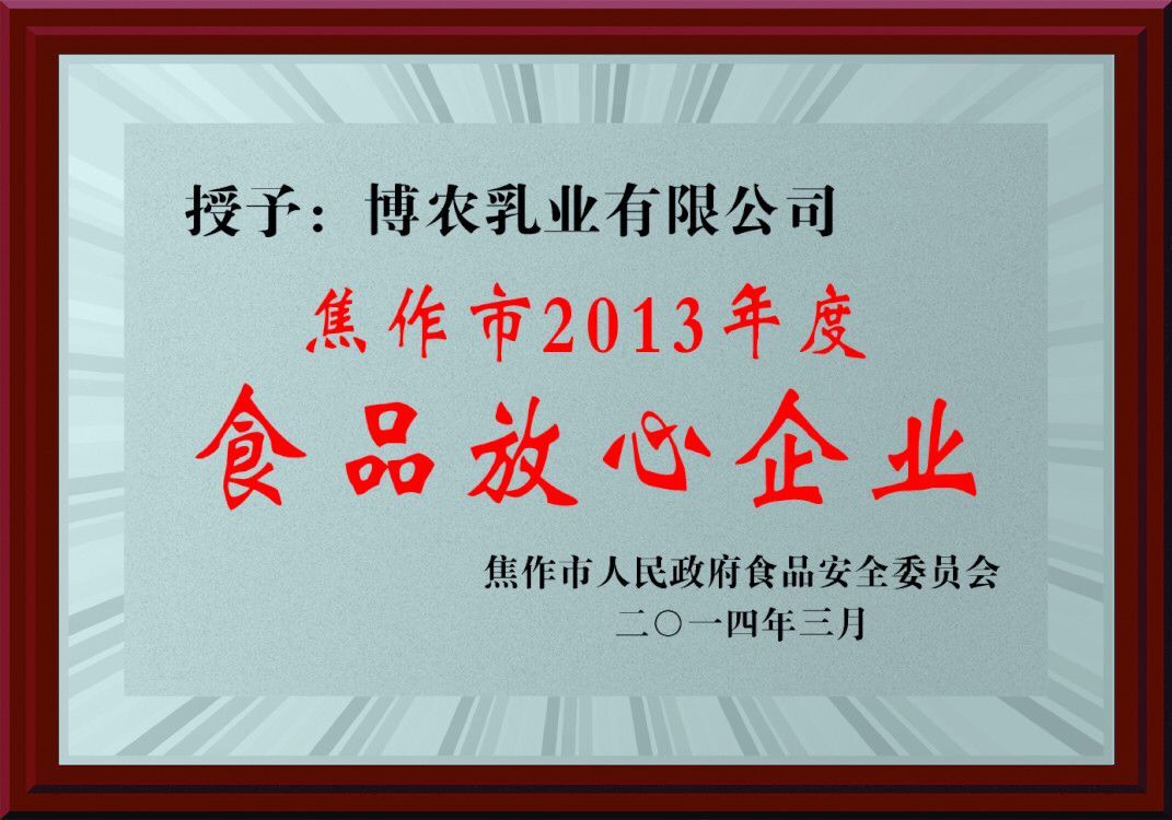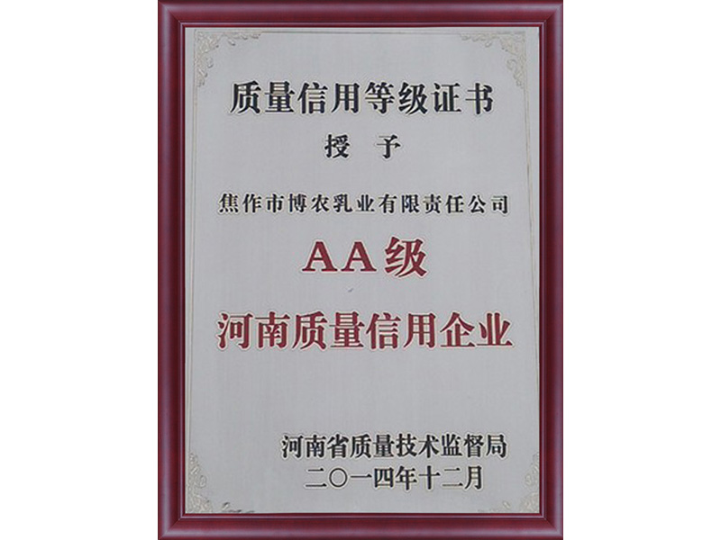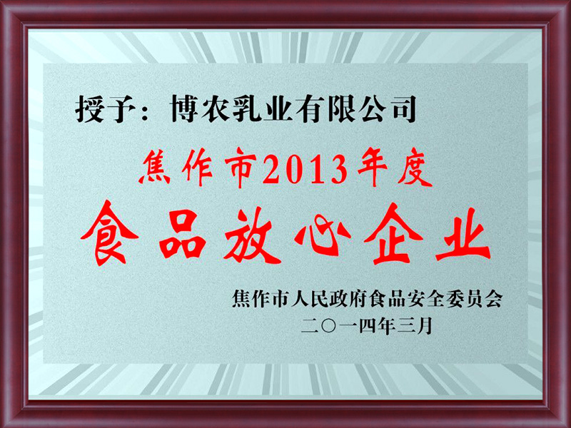 多年來(lái),公司始終秉承“追求健康品質(zhì)、立足誠(chéng)信服務(wù)”的經(jīng)營(yíng)理念,先后榮獲了“中國(guó)知名乳品信譽(yù)品牌”、“河南省乳品行業(yè)十大品牌”、“河南省農(nóng)產(chǎn)品加工業(yè)示范企業(yè)”、“河南省無(wú)公害畜產(chǎn)品產(chǎn)地認(rèn)定企業(yè)”、“河南省質(zhì)量信用AA級(jí)企業(yè)”、“河南省園林單位”、“河南省綠色企業(yè)”“焦作市農(nóng)業(yè)產(chǎn)業(yè)化龍頭企業(yè)”、“焦作市食品放心企業(yè)”、“焦作市誠(chéng)信食品生產(chǎn)企業(yè)”等榮譽(yù)稱號(hào)。